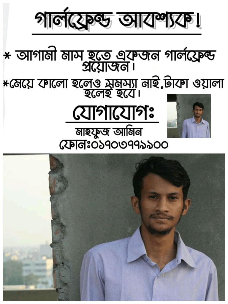 বহুদিন ধরে একটি গার্লফ্রেন্ড খুজে যাচ্ছেন সিঙ্গেল বালক মাহফুজ আমিন কিন্তু তিনি কোন ভাবেই গার্লফ্রেন্ড খুজে পাচ্ছেন না, তাই তিনি এক অভিনব কৌশল বের করেছেন কুমিল্লা শহরের মহিলা কলেজের আশেপাশের দেয়াল গুলোতে গার্লফ্রেন্ড আবশ্যক পোস্টার লাগিয়েছেন তিনি আশা করছেন এবার তিনি গার্লফ্রেন্ড পাবেন ১০০%